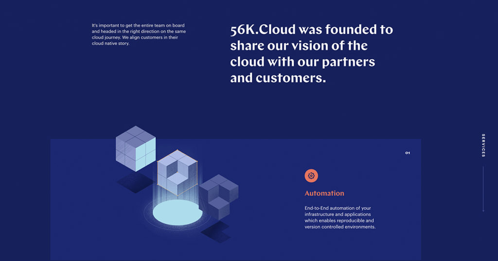 Quand un fournisseur de technologie cloud décide de se faire remarquer, cela donne un site à l’ergonomie et au design magnifiquement équilibré. Le naming numérique qui claque à l’essentiel, un mode illustré sobre et des enchaînements de pages fluides… Si les produits et services ne sont pas faciles à appréhender par les néophytes, parions que les pros des systèmes d’information seront séduits et accrochés par un webdesign high quality : bravo 56k.cloud !